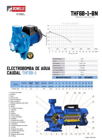 Electrobomba de Agua Centrífuga THF6B-1 - Bonelly Industrial La electrobomba centrífuga THF6B-1 está diseñada para ofrecer alto caudal y presión constante en aplicaciones residenciales, agrícolas o industriales ligeras. Su motor monofásico de 2HP y su robusto cuerpo azul aseguran eficiencia y durabilidad. Motor monofásico 220V / 60Hz Potencia de 2HP, ideal para riego o sistemas hidráulicos Salida 2x2 pulgadas para mayor flujo Cuerpo azul resistente a la corrosión 2 años de garantía por Bonelly Industrial Ideal para pozos, bombeo a tanques elevados, sistemas de presurización o riego tecnificado.