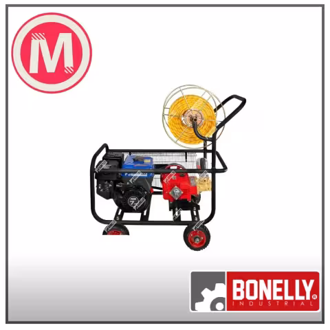 Hidrolavadora Bonelly 7HP con motor a gasolina azul, cabezal BNO-30C con pistones cerámicos, manguera reforzada de 50 metros e incluye lanza cerámica de 90 cm. 1 año de garantía.