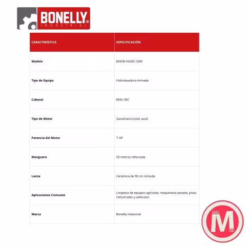 Hidrolavadora Armada Bonelly BN0B-HA30C.50M 7HP La BN0B-HA30C.50M es una hidrolavadora industrial equipada con un motor a gasolina de 7HP y un cabezal BNO-30C con pistones cerámicos que garantizan mayor durabilidad y resistencia. Viene con una manguera reforzada de 50 metros y una lanza cerámica de 90 cm para trabajos de alta exigencia. Características principales: Motor: Gasolina 7HP (color azul) Cabezal: BNO-30C con pistones cerámicos Manguera: 50 metros reforzada Lanza: Cerámica de 90 cm incluida Garantía: 1 año Fabricante: Bonelly Industrial Aplicaciones comunes: Limpieza de flotas, maquinaria agrícola o industrial Ambientes con alta presión operativa y uso prolongado Obras, patios, muros, establos, entre otros Ideal para quienes buscan mayor vida útil en cabezales de presión constante.