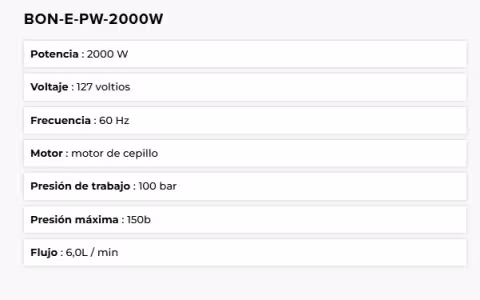 Hidrolavadora Bonhoeffer BON-E-PW-2000W La hidrolavadora BON-E-PW-2000W de Bonhoeffer es una solución potente para las tareas de limpieza más exigentes. Con 2000 W de potencia y una presión máxima de 150 bar, ofrece resultados óptimos con bajo consumo de agua y un diseño ergonómico con ruedas y carrete integrado. Poder: 2000 W Voltaje: 127 voltios Frecuencia: 60 Hz Motor: Motor de cepillo Presión de trabajo: 100 bar Presión máxima: 150 bar Flujo: 6,0 litros/minuto Accesorios incluidos: 1 pistola pulverizadora 1 manguera de alta presión de 5 m 1 cable de 5 m con enchufe 1 botella para jabón Conector 1X HPC Funciones adicionales: Parada automática al soltar el gatillo Diseño con ruedas y soporte para enrollado rápido Fabricada para mayor durabilidad y eficiencia Ideal para el hogar, limpieza de autos, herramientas, paredes, pisos y más.