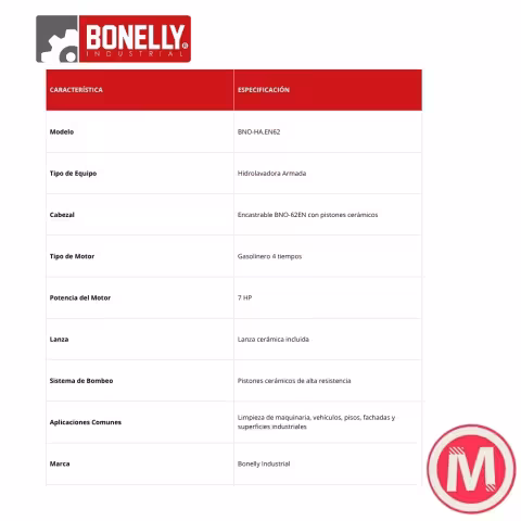 Hidrolavadora Industrial Bonelly BNO-HA.EN62 La BNO-HA.EN62 es una solución profesional para trabajos exigentes de limpieza, equipada con un potente cabezal encastrable BNO-62EN con pistones cerámicos que garantizan alta durabilidad, presión constante y rendimiento superior. Características destacadas: Motor: Gasolinero de 7HP Cabezal: Encastrable BNO-62EN con pistones cerámicos Lanza: Cerámica incluida Presión: Alta, ideal para entornos industriales Garantía: 1 año Marca: Bonelly Industrial Aplicaciones recomendadas: Lavado de maquinaria pesada Limpieza de superficies difíciles Ambientes agrícolas, de construcción y minería Ideal para profesionales que buscan fiabilidad, potencia y eficiencia continua en un solo equipo.