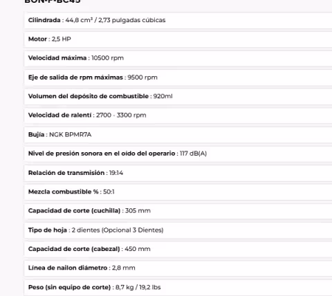 Desbrozadora Bonhoeffer BON-P-BP-BC45 La desbrozadora de mochila Bonhoeffer BON-P-BP-BC45 ofrece alto rendimiento y comodidad para tareas de limpieza, desbroce y mantenimiento de áreas verdes. Equipada con un motor de 2.5 HP a 2 tiempos, garantiza fuerza constante para cortar maleza, hierba y arbustos con facilidad. Características técnicas: Motor: 2.5 HP, 2 tiempos, refrigerado por aire Revoluciones del motor: 10,500 rpm (máx) Rpm del eje de salida: 9,500 rpm Capacidad del tanque de combustible: 950 ml Mezcla de combustible: 40:1 Diámetro del tubo de aluminio: 26 mm Capacidad de corte con cuchilla: 255 mm Capacidad de corte con cabezal: 450 mm Línea de nylon: 2.8 mm de diámetro Tipo de hoja: 3 dientes Potencia sonora: 117 dB(A) Peso neto sin accesorios: 11.1 kg Diseñada para brindar mayor comodidad al operador durante largas jornadas de trabajo gracias a su sistema de mochila acolchada. La marca Bonhoeffer se caracteriza por ofrecer soluciones duraderas para el sector agroforestal.