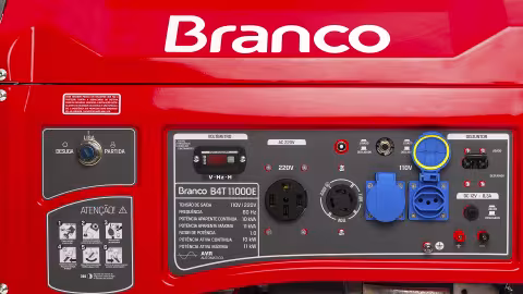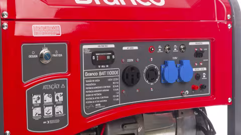 DADOS TÉCNICOS Motor: 4 tempos - Gasolina Potência Máxima do motor: 18,5 HP Cilindros: Monocilíndrico Cilindradas: 623 cc Combustível: Gasolina Capacidade do tanque: 40 L Óleo recomendado: 20W50 Capacidade do tanque de óleo: 1,5 L Sistema de partida: Elétrico / Manual Autonomia (50% de carga) 11,0 horas DADOS TÉCNICOS - GERADOR Potência Máxima do gerador: 11,0 kVA Potência Nominal do gerador: 10,0 kVA Fases: Monofásico Fator de potência: 1 Tensão principal de saída: 220V/110V - 50A Tomada auxiliares: 1 tomada - 220V/110V - 30A 2 tomadas - 110V - 20A Controle de tensão: AVR / com escova Carregador de bateria: 12V / 8,3A Bateria: Lítio Voltímetro: Sim - digital Horímetro: Sim - digital Medidor de frequência: Sim - digital Alerta de nível de óleo: Sim Bitola do fio recomendado: 10 mm² Nível de ruído: 84 dB DADOS LOGÍSTICOS Dimensão (Embalagem) CxLxA: 1030x700x780 mm Dimensão (Produto) CxLxA: 850x865x810 mm Peso Líquido/Bruto: 149 / 165,2 kg Garantia: 6 meses DIFERENCIAS Quadro robusto - reforçado Proteção no tanque de combustível AVR / com escova Carregador de bateria Possui voltímetro Alerta de nível de óleo Possui rodas para transporte ACESSÓRIOS Manual do usuário Kit ferramentas 1 Plug de tomada 30A 1 Plug de tomada 50A 1 Cabo de carga da bateria Kit para montagem das rodas e coxim frontal Branco Motores / Briggs & Stratton. LLC