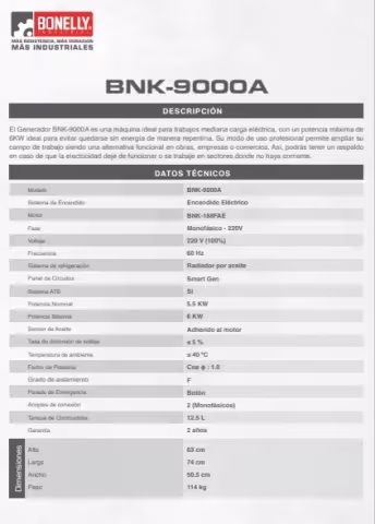 Generador Diésel Abierto BNK-9000A Monofásico 220V 6KW con Pre-calentador y Control Remoto - Bonelly Industrial El Generador Diésel Abierto Bonelly BNK-9000A es una solución práctica y potente para el suministro de energía en situaciones que requieren confiabilidad y alto rendimiento. Con salida monofásica de 220V y potencia nominal de 6KW, este equipo es ideal para negocios, casas de campo, talleres y uso en obras. Potencia nominal: 6KW Voltaje: 220V monofásico Frecuencia: 60Hz Tipo: Generador abierto (sin carcasa insonorizada) Sistema de arranque: Eléctrico con pre-calentador incorporado Control remoto: Incluido para operar a distancia Regulación de voltaje: Sistema AVR (Regulador Automático de Voltaje) Aplicaciones: Uso en exteriores, construcciones, talleres, eventos, entre otros Este modelo cuenta con control remoto para una operación más cómoda, y un pre-calentador que facilita el arranque en ambientes fríos. Su sistema AVR proporciona protección eléctrica para los equipos conectados, evitando picos de tensión. Gracias a su diseño abierto, es más accesible para mantenimiento y refrigeración natural, recomendado para usuarios que necesitan potencia a menor costo y no requieren funcionamiento silencioso.
