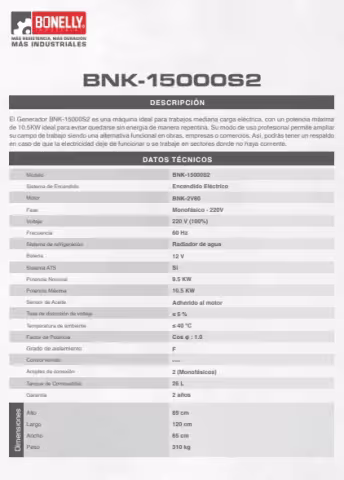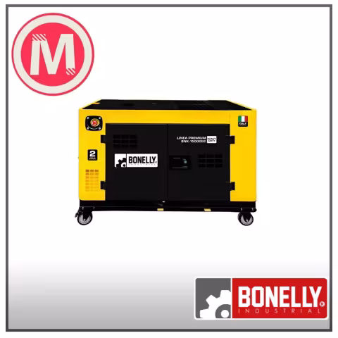 Generador Diésel Silencioso BNK-15000S2 Monofásico 220V 10.5KW, 2 Cilindros, con Pre-calentador y Control Remoto - Bonelly Industrial El Generador Diésel Bonelly BNK-15000S2 está diseñado para ofrecer un suministro eléctrico monofásico de alta potencia con un funcionamiento silencioso, ideal para aplicaciones industriales, residenciales y comerciales. Con una potencia nominal de 10.5KW y motor de 2 cilindros, este equipo garantiza eficiencia, autonomía y seguridad en entornos exigentes. Potencia nominal: 10.5KW Voltaje: 220V monofásico Motor: Diésel, 2 cilindros en línea Frecuencia: 60Hz Arranque: Eléctrico con pre-calentador (ideal para climas fríos) Control remoto: Incluido, permite encendido y apagado a distancia Sistema AVR: Regulador Automático de Voltaje para protección de equipos conectados Funcionamiento: Silencioso con sistema de insonorización profesional Aplicaciones: Uso continuo en casas de campo, obras, talleres, oficinas, ferias y comercios El BNK-15000S2 está diseñado para brindar máxima estabilidad eléctrica, protección contra sobrecargas y larga autonomía. Su motor de doble cilindro asegura mayor torque y capacidad para alimentar múltiples equipos en simultáneo. Gracias a su pre-calentador, ofrece encendido fiable incluso en temperaturas bajas. Una opción robusta y moderna para quienes necesitan potencia real, operación silenciosa y fácil control en entornos donde el suministro eléctrico no puede fallar. Respaldado por la garantía de calidad Bonelly Industrial.
