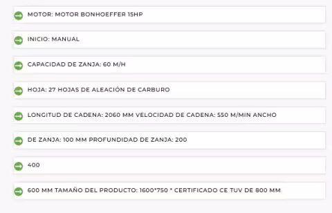 Zanjadora Bonhoeffer BON-P-GTH-1560 La zanjadora Bonhoeffer BON-P-GTH-1560 es la solución ideal para excavaciones rápidas, profundas y precisas. Diseñada para aplicaciones agrícolas, de construcción y obras civiles, combina potencia, durabilidad y eficiencia en un solo equipo. Motor: 15 HP Inicio: Manual Capacidad de zanja: 60 metros/hora Hoja: 27 hojas de aleación de carburo Longitud de cadena: 2060 mm Velocidad de cadena: 550 m/min Ancho de zanja: 100 mm Profundidad de zanja: 200, 400 y 600 mm Tamaño del producto: 1600 mm x 750 mm x 800 mm Certificación: CE TÜV Ideal para crear zanjas para sistemas de riego, cables eléctricos subterráneos y más, garantizando un trabajo rápido y limpio.