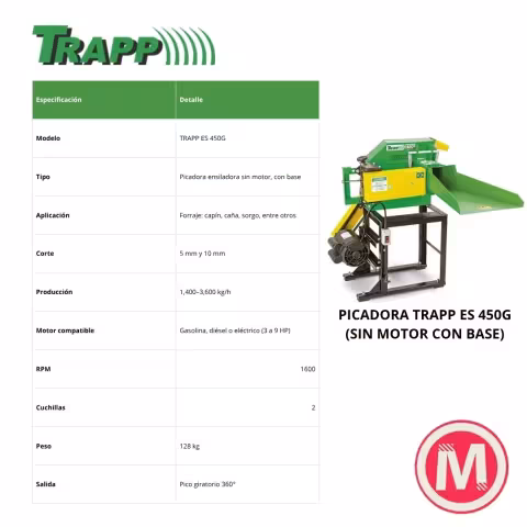 Ensiladora de gasolina ES-450 sin motor con base Trapp Trapp Siler sin motor con base ES-450, capacidad de 1.400/5.000 kg/h La ensiladora Trapp ES-450 es la solución perfecta para cortar pasto, sorgo, caña de azúcar y otros alimentos para ganado, caballos, jabalíes, emús, avestruces y otros animales. Con una capacidad de producción de 1.400 a 5.000 kg/h, esta máquina de ensilado garantiza que cada tipo de rebaño reciba el alimento en trozos uniformes y en la medida correcta. Ventajas: Cuerpo construido con chapa de 4,25 mm de grosor, proporcionando durabilidad y resistencia. Interruptor bipolar en los modelos monofásicos y tripolar en los trifásicos, que garantiza un aislamiento total independientemente de la posición del enchufe en la toma de corriente. Termine con un tratamiento anticorrosivo en todas las piezas sujetas a oxidación y pinte con pintura en polvo de poliéster polimerizada en horno a 220 °C, lo que garantiza una mayor durabilidad y un acabado de calidad. Especificaciones técnicas: Tamaño de corte: 5 mm y 10 mm Relación para ajustar la longitud de corte: ajuste la correa a la posición adecuada para la longitud de corte deseada. Motor eléctrico recomendado: Potencia: 3 CV Velocidad de la máquina: 3.600 rpm Motor de combustión indicado: Potencia: 7 CV Velocidad de la máquina: 3.600 rpm Elementos incluidos: 1 Ensiladora sin motor 1 embudo alimentador 4 cojines 1 kit manual 1 base universal Código de referencia: 2932611 La ensiladora Trapp ES-450 es la elección correcta para optimizar la producción de alimentos para sus animales, proporcionando calidad y eficiencia.