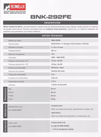 Motor diésel Bonelly BNK-292FE de 26HP y 2 cilindros, con una impresionante cilindrada de 997 cc. Equipado con sistema de arranque manual y eléctrico, ideal para maquinaria de alto rendimiento.