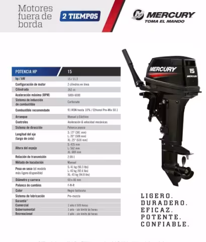 Motor Fuera de Borda Mercury 15HP 2 Tiempos – Modelo 15 MH El Mercury 15 MH es un motor fuera de borda de 2 tiempos con 15 caballos de fuerza, diseñado para ofrecer un rendimiento óptimo en embarcaciones pequeñas y medianas. Su arranque manual y eje corto de 15″ lo hacen ideal para botes de pesca, lanchas y otras embarcaciones ligeras. Características técnicas: Potencia: 15 HP / 11.2 kW Tipo de motor: 2 tiempos, 2 cilindros en línea Desplazamiento: 262 cc Rango de RPM: 5000 – 6000 RPM Sistema de combustible: Carburado, mezcla premezclada Relación de engranajes: 2.00:1 Arranque: Manual Dirección: Timón (mango) Longitud del eje: 15″ (381 mm) Peso en seco: 35 kg Marchas: Adelante, Neutro, Reversa Tanque de combustible: Externo de 12 litros Inclinación: 6 posiciones Color: Negro Garantía: 1 año Aplicaciones recomendadas: Botes de pesca Lanchas pequeñas Embarcaciones recreativas en lagos y ríos Este motor destaca por su ligereza y facilidad de transporte, siendo una opción confiable para quienes buscan eficiencia y rendimiento en sus actividades náuticas.