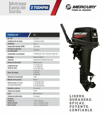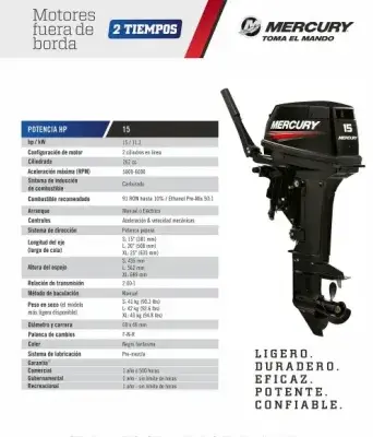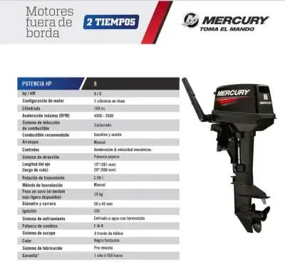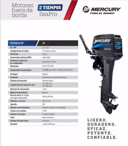 Motor Fuera de Borda Mercury 25HP 2 Tiempos SeaPro – Modelo 25 MH SeaPro El Mercury 25 MH SeaPro es un motor fuera de borda de 2 tiempos con 25 caballos de fuerza, diseñado específicamente para aplicaciones comerciales exigentes. Su arranque manual y eje corto de 15″ lo hacen ideal para embarcaciones de trabajo que requieren fiabilidad y rendimiento constante. Características técnicas: Potencia: 25 HP / 18.4 kW Tipo de motor: 2 tiempos, 2 cilindros en línea Desplazamiento: 430 cc Rango de RPM: 5000 – 6000 RPM Sistema de combustible: Carburado, mezcla premezclada Relación de engranajes: 1.92:1 Arranque: Manual Dirección: Timón (mango) Longitud del eje: 15″ (381 mm) Peso en seco: 51 kg Marchas: Adelante, Neutro, Reversa Tanque de combustible: Externo de 12 litros Inclinación: 4 posiciones Color: Negro Garantía: 1 año uso deportivo / 6 meses uso comercial Aplicaciones recomendadas: Embarcaciones de pesca comercial Transporte fluvial Operaciones en aguas interiores y costeras Este motor destaca por su durabilidad y eficiencia de combustible, siendo una opción confiable para quienes buscan rendimiento y resistencia en sus actividades náuticas comerciales.
