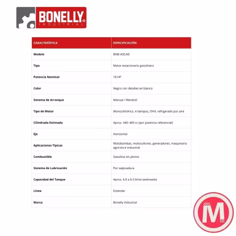 Motor Gasolinero Bonelly BNB-450.NE - 18HP con Arranque Manual El BNB-450.NE es un motor robusto de alto rendimiento, diseñado para aplicaciones pesadas en agricultura, construcción e industria. Cuenta con 18 caballos de fuerza y arranque manual retráctil, ofreciendo fiabilidad y potencia para todo tipo de maquinaria. Características principales: Modelo: BNB-450.NE Potencia: 18HP Tipo de arranque: Manual / Retráctil Color: Negro Garantía: 1 año Marca: Bonelly Industrial Aplicaciones ideales: Motobombas Generadores eléctricos Mezcladoras y maquinaria de construcción Equipos agrícolas